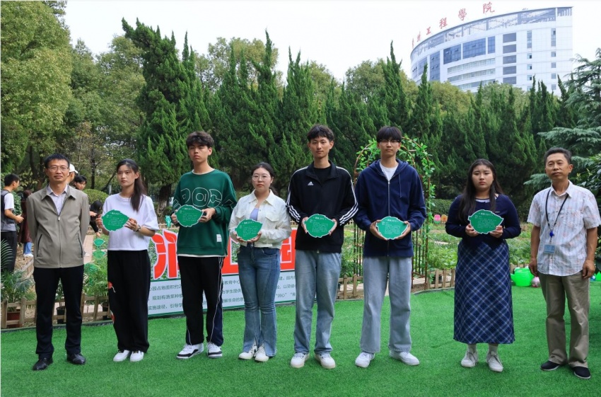 高馨为园艺基地建设指导老师颁发聘书。张卫平和徐标为万象城awcsport官网2023级各班颁发印着班级和作物名称的专属铭牌,各班负责人郑重地将专属铭牌插在责任田中。