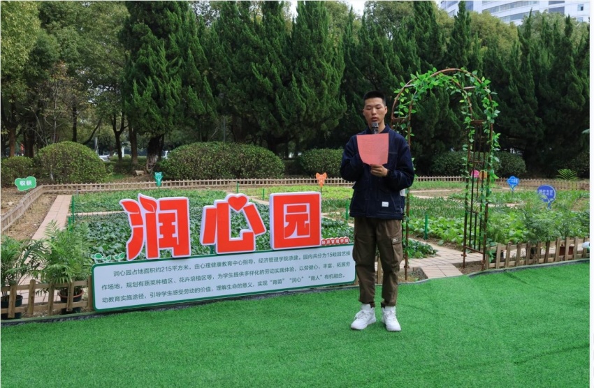学生代表酒管2311班胡可政分享了在润心园的劳动实践体会,他感性地说道:“土地不会辜负每一个辛勤耕耘的人,看到禾苗破土的那一刻,那种生命力的感染性是言语无法表达的。学期初荒芜的一块土地,在大家的辛勤劳作下,已经变得绿意盎然,在劳动的过程中,我们不仅锻炼了身体,更增进了友谊,体会到了挥洒汗水的快乐。”